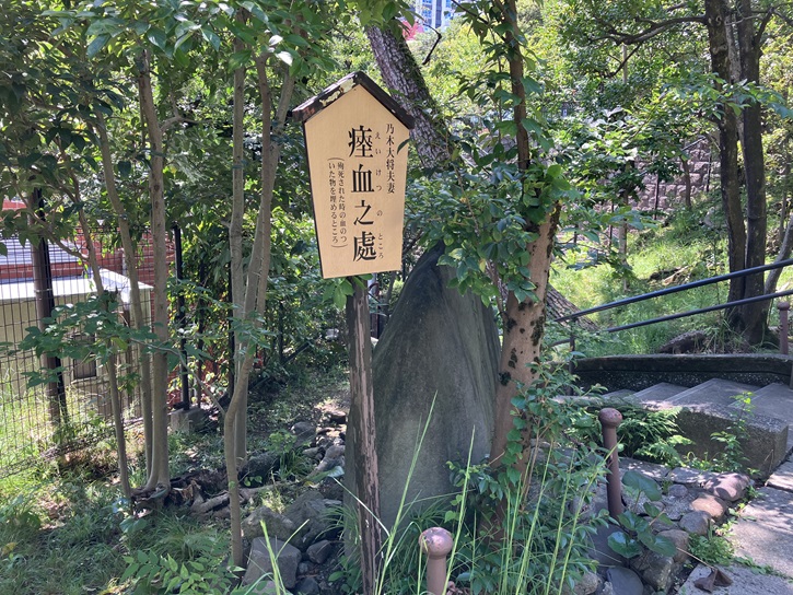 階段を下りたところにある菜園の奥に、乃木大将夫妻が殉死された時に血の付いたものを埋めた碑が建っています。