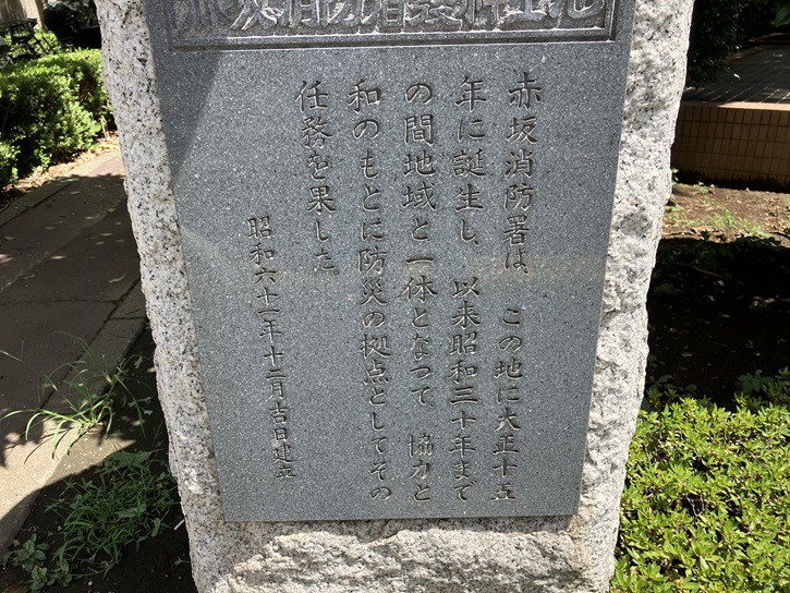 赤坂消防署は、この地に大正十五年に誕生し、以来昭和三十年までの間地域と一体となって、協力と和のもとに防災の拠点としてその任務を果たした。