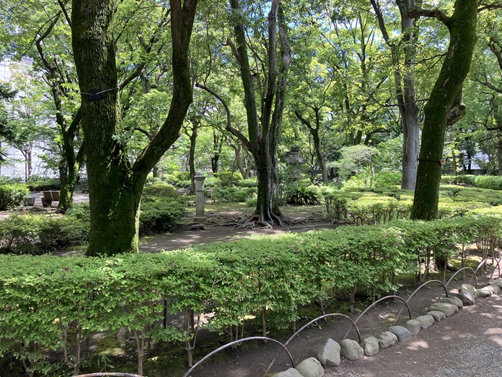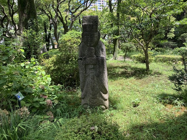 公園は、手前にすべり台や砂場がある遊具スペース、奥に池や木々が配された庭園スペースとなっています。庭園スペースには、多くの石像や石燈籠が置かれ、和漢折衷の独特な雰囲気があります。緑豊かな庭園スペースに足を踏み入れると、木々のゆれる音や水のせせらぎが聞こえ、都会の喧騒から一歩遠ざかってリラックスした気分になります。