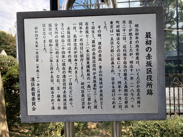 明治初年の地方制度は、いくたびか改正の繰り返しが続きましたが、明治十一年(1878年)七月二十二日、近代地方自治の歴史上画期的な郡区町村編制法などの公布によって、同年十一月二日、東京は十五区六郡に区画され、区会も設けられました。その時、現在の赤坂・青山の地域が赤坂区として誕生し、最初の赤坂区役所が赤坂表町三−五(現在赤坂七−二[本公園東隣敷地の一画])に置かれ、同年十一月四日に開庁しました。初代区長は翌年一月、島津忠亮が任命されました。赤坂区役所はその後、表町一丁目などに移り、さらに明治二十四年に現在の港区役所赤坂地区総合支所の位置に移りました。なお、芝・麻布・赤坂区は、昭和二十二年三月十五日、統合されて港区となりました。