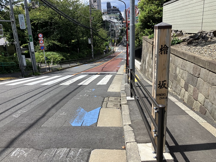 檜坂は長さが約130mほどの坂で、別名を「清水坂」といいます。坂名は、江戸時代に檜の木が多かったために檜屋敷と呼ばれた山口藩毛利邸前の坂であったことに由来しています。