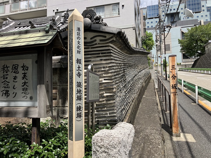 檜坂から「三分坂」に向かいます。赤坂学園(令和五年度に赤坂小学校と赤坂中学校が統合され、小中一貫校となりました)から小路を進んだ先の三分坂下付近に報土寺があります。報土寺は、江戸時代初期の1614年に創建されました。報土寺を開いた永受法師は越前の武将である朝倉義景の末裔で、義景がいつも兜の中に入れていたと伝えられる阿弥陀如来像が報土寺の本尊となっています。当初は現在の赤坂5丁目付近にありましたが、江戸幕府による用地取り上げにより、1780年に現在の地に移転しました。太平洋戦争の空襲で本堂を焼失しましたが、1965年に再建されました。三分坂に沿って建つ築地塀(瓦を積み上げ、塗りかためた塀)はこの地に移転してきた当時のもので、江戸時代の寺院の姿を今に伝える貴重な建造物として港区の文化財に指定されています。