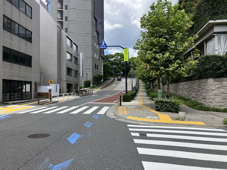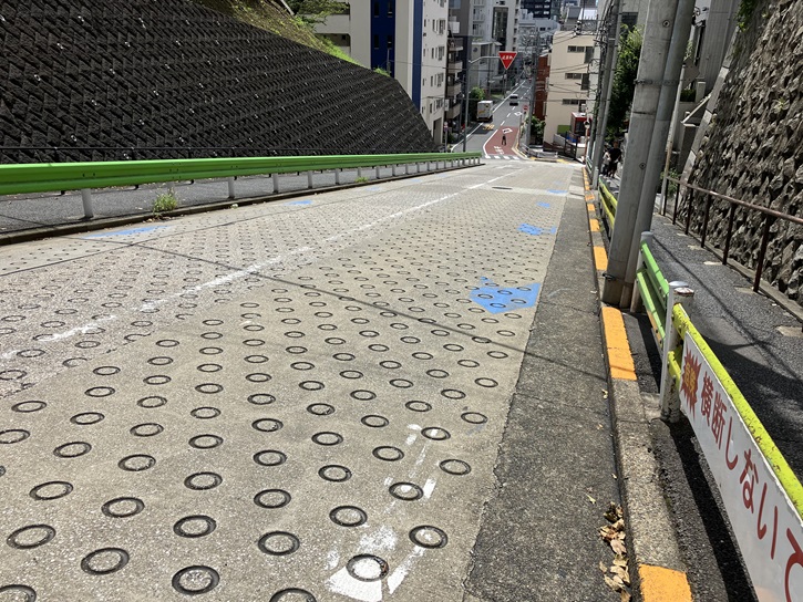 六本木中学校付近から六本木交差点までは、緩やかに曲がりながら坂が上がっています。