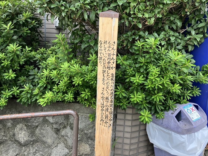 さんぷんざか 急坂のため通る車賃を銀三分(さんぷん、百円余)増したためという。坂下の渡し賃一分に対していったとの説もある。さんぶでは四分の三両になるので誤り。