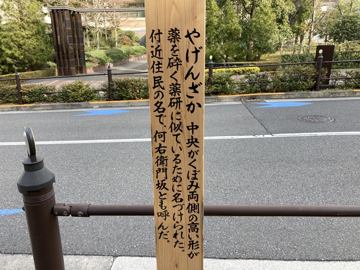 やげんざか 中央がくぼみ両側の高い形が薬を砕く薬研に似ているために名づけられた。付近住民の名で、何右衛門坂とも呼んだ。