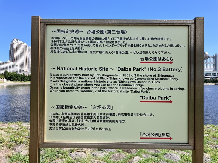 It was a gun battery built by Edo shogunate in 1853 off the shore of Shinagawa in preparation for the arrival of Black Ships known by Commodore Matthew Perry. It was designated a national historic site as "Shinagawa Daiba" in 1926. It is the closest place where you can see the Rainbow Bridge. Grass is beautifully green in the park where is well-known for cherry blooms in spring. When you come to "Odaiba", visit the historical site "Daiba Park".