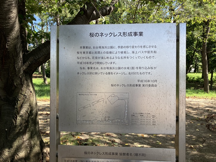 本事業は、お台場海浜公園に、季節の移り変わりを感じさせる桜を東京都と民間との協働により植栽し、海上バスや屋形船などからも、花見が楽しめるような名所をつくっていくもので、平成十六年度より開始しています。なお、事業名は、お台場海浜公園の水域(面)を取り込み桜がネックレス状に咲いている様をイメージし、名付けたものです。