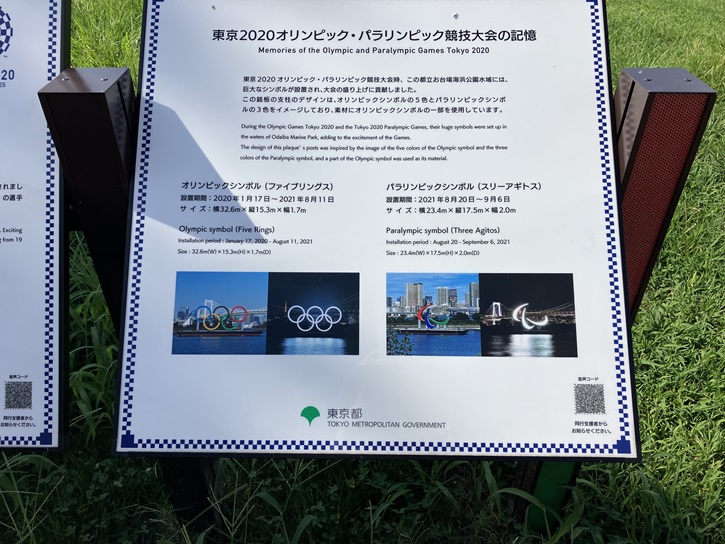 東京2020オリンピック・パラリンピック競技大会時、この都立お台場海浜公園水域には、巨大なシンボルが設置され、大会の盛り上げに貢献しました。この銘板の支柱のデザインは、オリンピックシンボルの5色とパラリンピックシンボルの3色をイメージしており、素材にオリンピックシンボルの一部を使用しています。
