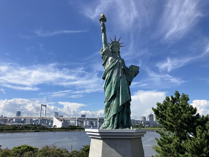 自由の女神像といえば、ニューヨークのリバティ島にある自由の女神像が有名です。リバティ島の自由の女神像は、高さ(台座から右手のトーチまで)が46.05mで、台座まで含めると93mもあります。一方、お台場の自由の女神像は、高さが11.5mで、台座を含めても17.4mしかありません。ですが、お台場の自由の女神像はスケールこそ小さいですが、重量は9トンもあり、かなり本格的な作りをしています。お台場の自由の女神像は二代目で、初代の像は「日本におけるフランス年」事業の一環として1998年4月29日から1999年5月9日まで設置されていました。初代の像は、パリのセーヌ川のシーニュ島に1889年に作られた本家「自由の女神像」を、設置から109年目にして初めてパリを離れ、はるばる海を渡ってお台場海浜公園に設置したものです。この事業では、フランス大統領のジャック・シラクと内閣総理大臣の橋本龍太郎が参加して、1998年4月28日に点火式が行われました。記念公開後はフランスに帰る予定の自由の女神像でしたが、レインボーブリッジを背景としてお台場に立つ優美な姿は日仏友好のシンボルとして多くの人々に愛され、像のフランスへの帰国が近づくにつれてお台場にも新たな像の建設を望む声が強まりました。そうした背景のもと、オリジナル像からの完全復刻像製作案が立ち上がり、オリジナル像所有者であるパリ市に申請し、日本におけるフランス年実行委員会や駐日フランス大使館の協力を得て、1999年3月にパリ市からの正式許可を受け、フランスに帰った「自由の女神像」から型を取ったレプリカ制作が開始されました。そして2000年12月22日、フランスのクーベルタン鋳造所にて製作され、運ばれたお台場の自由の女神像(二代目)が序幕されました。このフランス政府公認のレプリカは「台場の女神」という別名で呼ばれることもあります。ちなみに、ニューヨークの自由の女神像は、1886年にフランス政府からアメリカ独立100周年を記念して贈られたもので、パリの自由の女神はそのお返しとしてフランス革命100周年を記念してパリに住むアメリカ人達から寄贈されたものです。