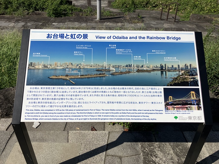 台場公園は、お台場海浜公園と地続きになって東京湾に突き出ています。地続きになっているところには遊歩道が整備されています。遊歩道の入口付近に東京都港湾局が設置した石碑が置かれています。
