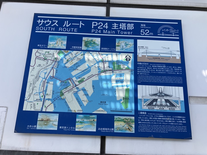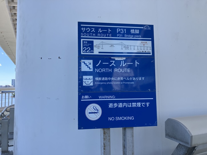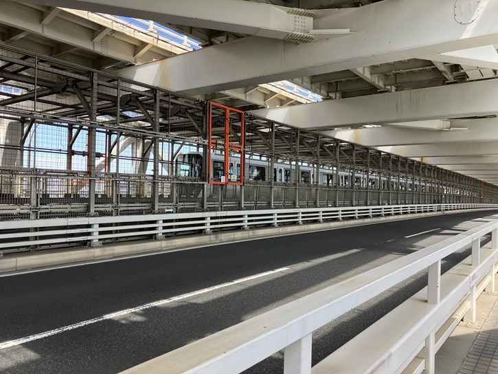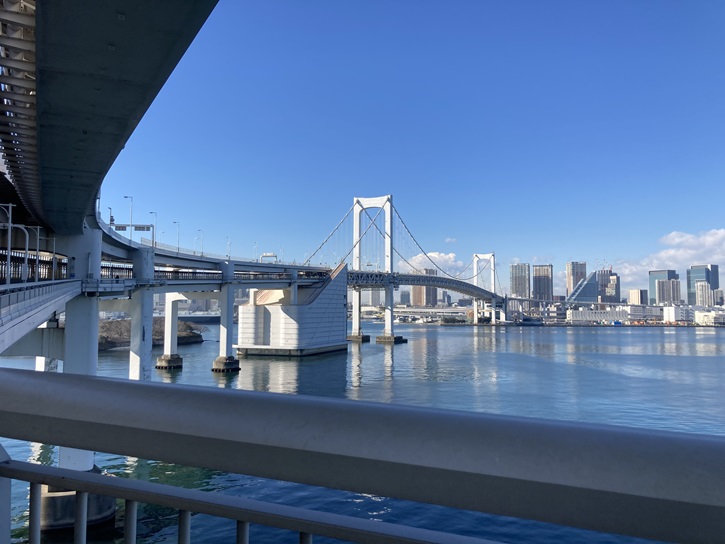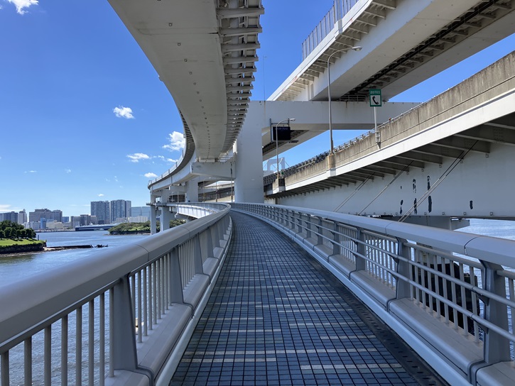 レインボーブリッジは、芝浦側入口から台場入口まで遊歩道を歩きます。レインボーブリッジは二重構造の複合交通施設のつり橋で、下層は遊歩道・臨港道路・新交通ゆりかもめの軌道が走り、上層は首都高速11号台場線が通っています。