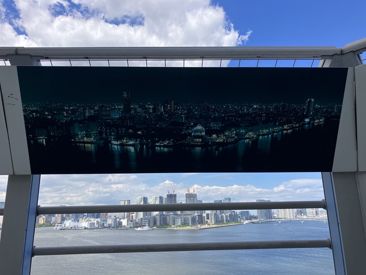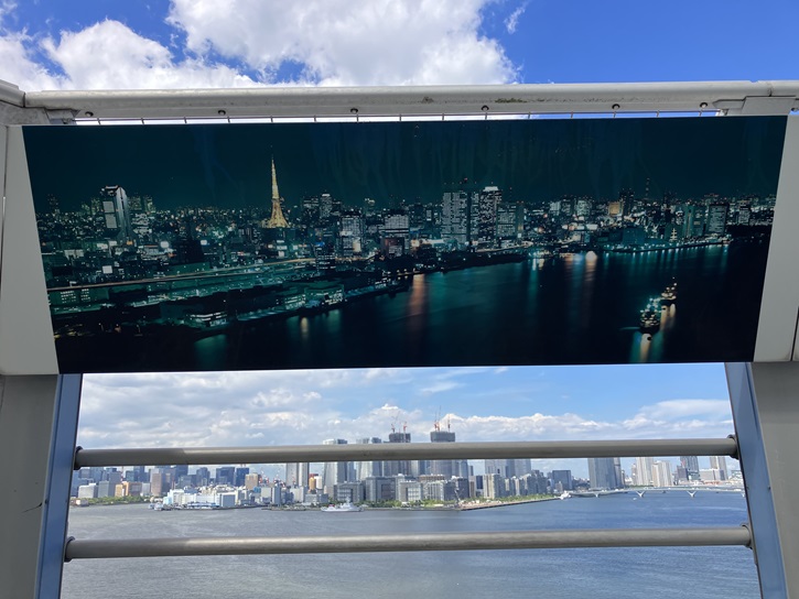 レインンボーブリッジから夜の都心を眺める機会は殆どありませんが、昼間に撮った写真と一緒に夜間に撮った写真のパネルも掲示されています。東京タワーをほぼ同じ方向で昼と夜で見ると随分と印象が違いますね。
