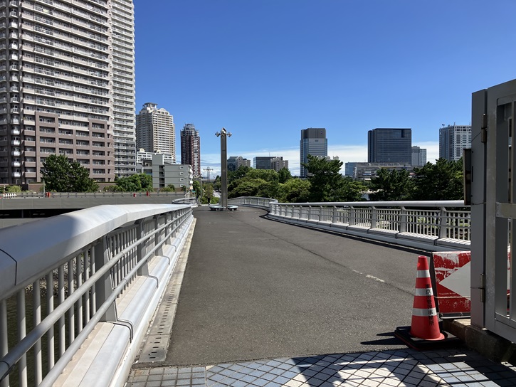 ノースルートからは都心のビル群が眺められます。左の写真の中層の建物が密集したところは東京2020オリンピックの選手村だった晴海フラッグです。右の写真の正面の建物群は豊洲市場です。豊洲市場脇から晴海地区に渡る橋は環状二号線です。どれも曰く付きの施設ですね。