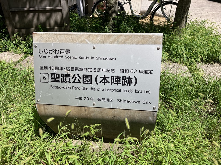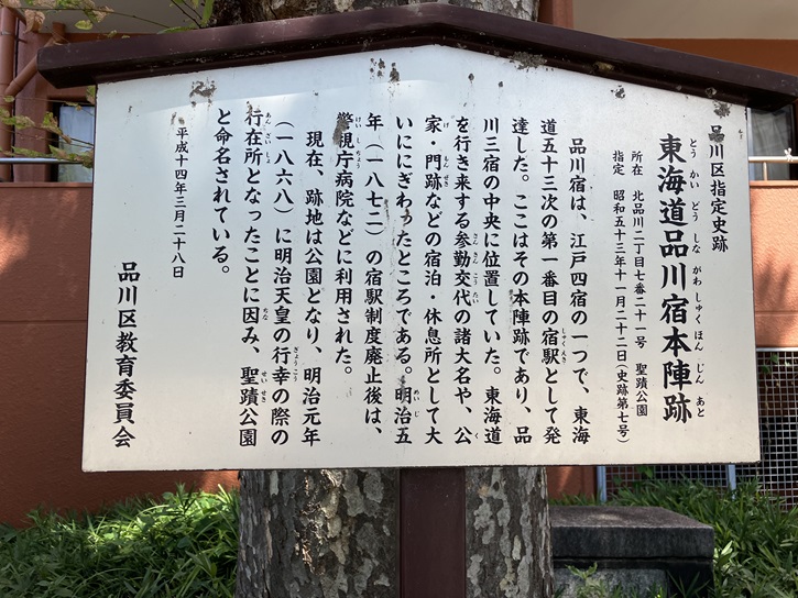 旧東海道に面して「聖蹟公園」があります。公園の入口の右側の門柱には「品川区立聖蹟公園」、左側の門柱には(松の木でよく見えませんが)「品川宿本陣跡」と書かれています。東海道品川宿の本陣跡は、明治五年に宿駅制度が廃止された後は警視庁品川病院となりましたが、昭和十三年に公園として整備され今に至っています。明治元年(1868年)の明治天皇東幸の際に行在所となったことで、「聖蹟公園」という名称になりました。