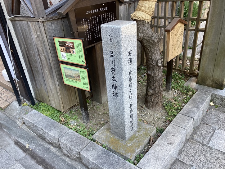 江戸時代の本陣は、宿場で大名や旗本・門跡・公家などが休息や宿泊するところで、品川宿には初め南品川宿と北品川宿に一軒ずつありましたが、江戸中期には北品川宿のみとなりました。大名などが宿泊すると本陣には大名の名を記した関札をたて、紋の入った幕をめぐらしました。明治維新後、京都から江戸へ向かった明治天皇の宿舎(行在所)にもなったところです。