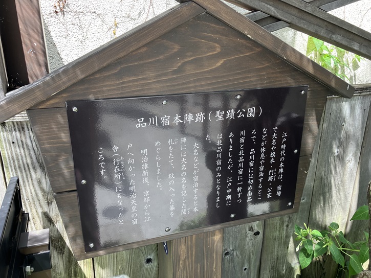 品川宿は、江戸四宿の一つで、東海道五十三次の第一番目の宿駅として発達した。ここはその本陣跡であり、品川三宿の中央に位置していた。東海道を行き来する参勤交代の諸大名や、公家・門跡などの宿泊・休息所として大いににぎわったところである。明治五年(1872年)の宿駅制度廃止後は、警視庁病院などに利用された。現在、跡地は公園となり、明治元年(1868年)に明治天皇の行幸の際の行在所(あんざいしょ)となったことに因み、聖蹟公園と命名されている。