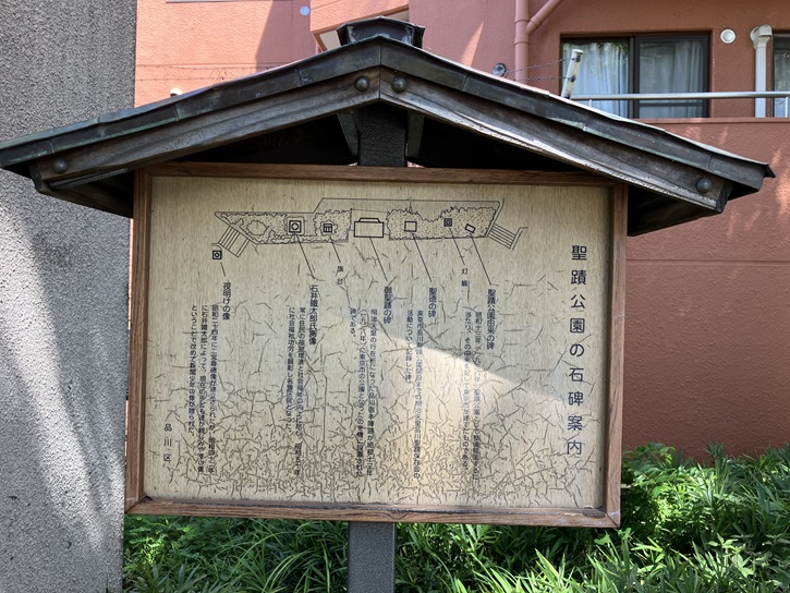 公園内には、当時の東京市長の撰文になる「聖蹟公園由来」の碑・「景仰聖徳」の碑・「御聖蹟」の碑・「石井鐵太郎翁之像」などの記念碑が建っています。石井鐵太郎の提案によって昭和四十二年に建てられた「夜明けの像」という新聞配達の少年の像は、昭和二十四年に建てられた二宮尊徳像に替えて設置したものです。「聖蹟公園の石碑案内」に従って、右側から見ていきます。