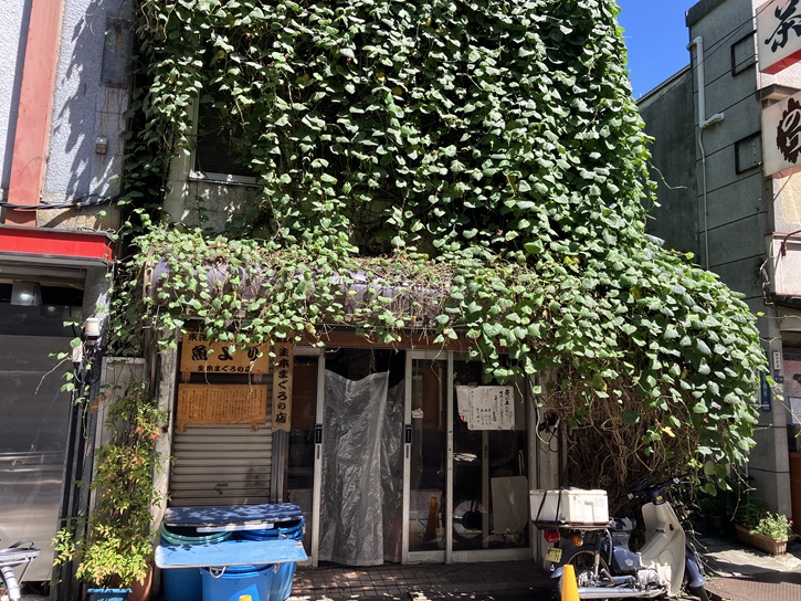 聖蹟公園から「品川浦」に向かいます。旧東海道沿いにある生本まぐろが売りの魚屋さん「魚より」の看板の下に、何故か「京浜急行新馬場駅の由来」と題された案内板が掛けられています。