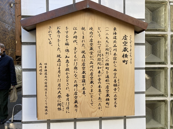 東海道北品川本宿から西方の養願寺(正安元年【1299年】の開創)への横町を通称「虚空蔵横町」という。かつては阿弥陀如来が寺の本尊であったが、境内の虚空蔵堂が「品川の虚空蔵さま」として親しまれた。現在は虚空蔵菩薩が本尊。江戸時代、子どもが13歳になった時に虚空蔵参りをすると福・徳・知恵を授かるとされ、毎月13日にお参りをした。現在は4月と11月の大祭に開帳されている。