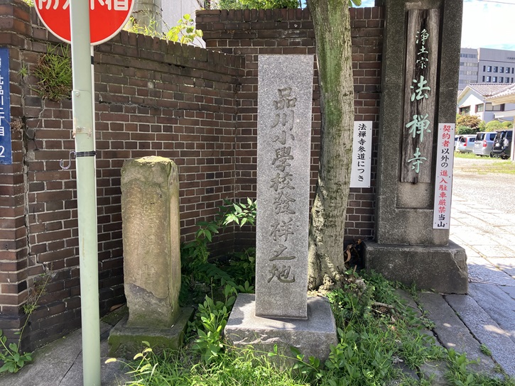 法禅寺の門の脇に石碑が建っています。品川小学校は品川区内で創立した最も古い小学校です。明治六年(1873年)に、都築幾三郎という人がこの法禅寺のすぐ北にある善福寺を借りて算術中心の寺子屋を始めました。まもなく法禅寺に移りますが、地元の戸長がこれに目をつけて、明治七年(1874年)に公立学校にすることを申請して認められました。当初の名前は第一大学区第二中学区第六番公立小学校品川学校でした。その後、義務教育化や周辺の人口増加と共に学校の規模も大きくなり、大正十三年(1924年)に京浜急行線を挟んで西側の現在の品川学園の敷地に移転しました。