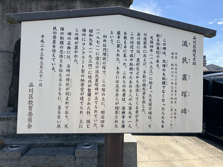 この碑は、天保の大飢饉でなくなった人たちを祀る供養塔である。天保四年(1833年)に始まった天候不順は、その後数年におよび、多数の餓死者を出した。品川宿には、農村などから流浪してくる者が多く、この付近で病や飢餓でたおれる人が八百九十一人を数えるに至った。これらの死者は、法禅寺と海蔵寺に葬られた。本寺には五百余人が埋葬されたという。初めは円墳状の塚で、この塚の上に、明治四年(1871年)に造立の流民叢塚碑が立てられていた。昭和九年(1934年)に境内が整備された折、同じ場所にコンクリート製の納骨堂が建てられ、上にこの碑が置かれた。碑の正面には、当時の惨状が刻まれており、天保の飢饉の悲惨さを伝えるとともに、名もない庶民の存在を伝えている。