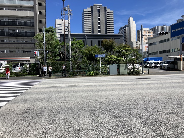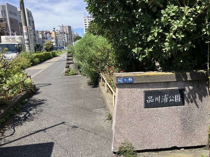 北品川ゆうゆうプラザから道なりに進んで八ツ山通りに出ます。通りに沿って細長い公園があります。