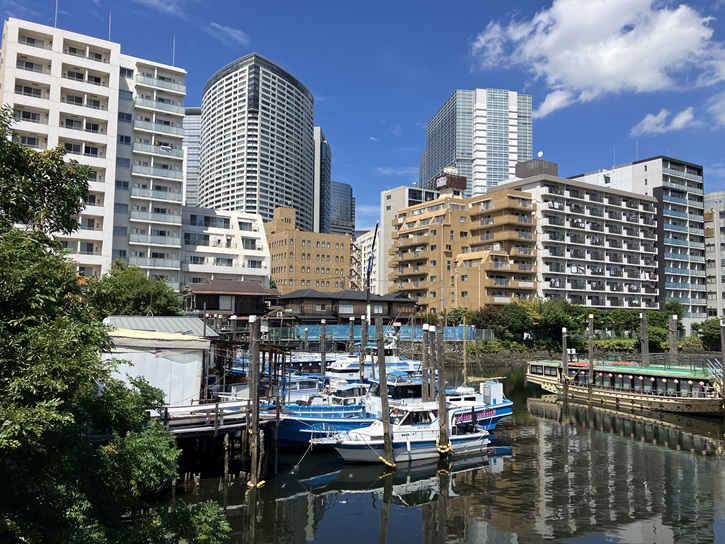 かっては豊富な水揚げがあり、海苔の主要な産地でもありました。現在ではビル群を背景に、つり船や屋形船が並んでいます。