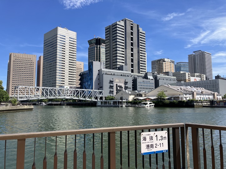 高浜運河を楽水橋で渡ります。楽水橋は昭和四十四年3月に架け替えられ、長さ76.6m・幅4.5m(車道4.0m)で、隣に昭和五十二年10月に竣工した幅2.3mの歩道橋を併設しています。橋名は、東京水産大学同窓会名楽水会に由来したといわれていて、平成十六年に東京水産大学から港区に移管されました。