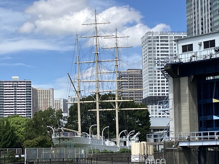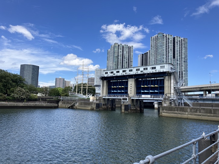 天王洲ふれあい橋から「東品川海上公園」に向かいます。天王洲運河には、京浜運河との間に天王洲水門があります。水門の左手の東京海洋大学構内には、雲鷹丸が展示されています。雲鷹丸は、漁業練習船および漁業調査船として使用された3本マストの帆船です。明治四十二年(1909年)5月から昭和四年(1929年)8月まで20年間にわたり36回の航海を行うと共に、捕鯨実習を始め、漁業調査・学生実習・漁撈技術・漁具開発などに貢献し、漁獲物処理では船上でのカニ缶詰製造に成功し、後の大型蟹工船の先駆けとなりました。昭和三十七年(1962年)に東京海洋大学品川キャンパスに移設され、平成十年(1998年)12月11日に国の登録有形文化財として登録されました。