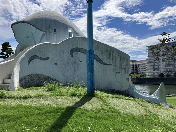 東品川海上公園は、目黒川が天王洲南運河に注ぎ込む河川部に位置し、アイル橋を挟んで北側と南側に分かれています。北側は天王洲公園に隣接し、鯨をイメージした大きな滑り台が設置された芝生広場があります。滑り台は、種類や長さの違うものが5本もあります。約200年前にこの地域に鯨が漂着し、日本人が初めて捕鯨した場所だという言い伝えから、鯨の滑り台ができたのだそうです。