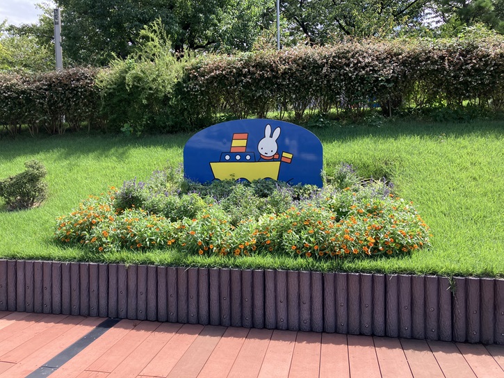 アイル橋を渡った右手の運河沿いにミッフィー花壇があります。「ミッフィー」は、オランダの絵本作家ディック・ブルーナが描いた絵本の主人公の兎の女の子のキャラクターで、日本では「うさこちゃん」の名前でも知られています。ちなみに、「ミッフィー」は英語での呼称で、元々のオランダ語では小兎を意味する「ナインチェ・プラウス」というキャクター名です。