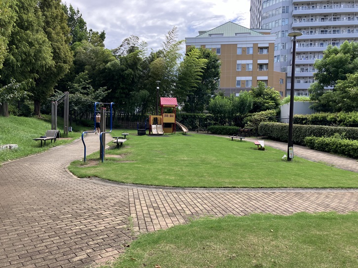 アイル橋で繋がれた水辺の公園です。北側にはクジラを模した遊具があり、南側は東品川屋上庭園と隣接しています。