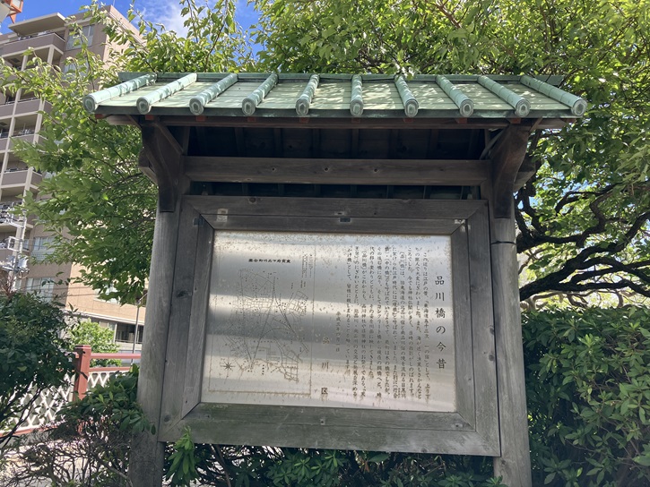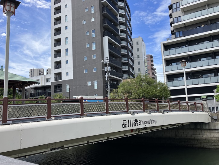 この辺りは江戸の昔、「東海道五十三次 一の宿」として、上り下りの旅人で大変にぎわいました。また、海が近く漁業もさかんなところでした。今でも神社仏閣が多く、当時の面影がしのばれます。[品川橋]は、旧東海道の北品川宿と南品川宿の境を流れる目黒川に架けられ江戸時代には[境橋]と呼ばれていました。また別に[行合橋]・[中の橋]とも呼ばれていたようです。最初は木の橋でしたが、その後石橋になり、そしてコンクリート橋から現在の鋼橋へと、時代の移り変わりとともに、その姿を川面に映してきました。[品川橋]がこれからも、品川神社や荏原神社のお祭りである、「天王祭」のにぎわいとともに、北品川・南品川の交流と発展を深める「かけ橋」として、皆様に親しまれることを願っています。