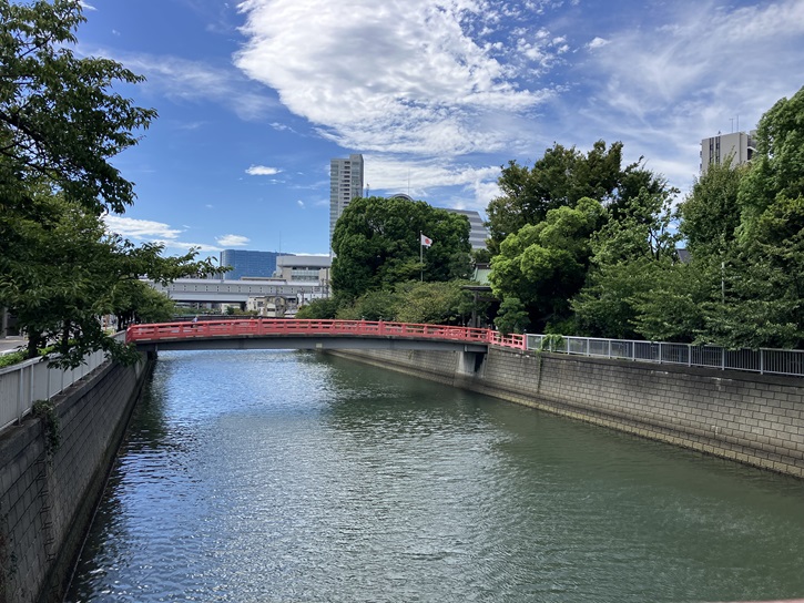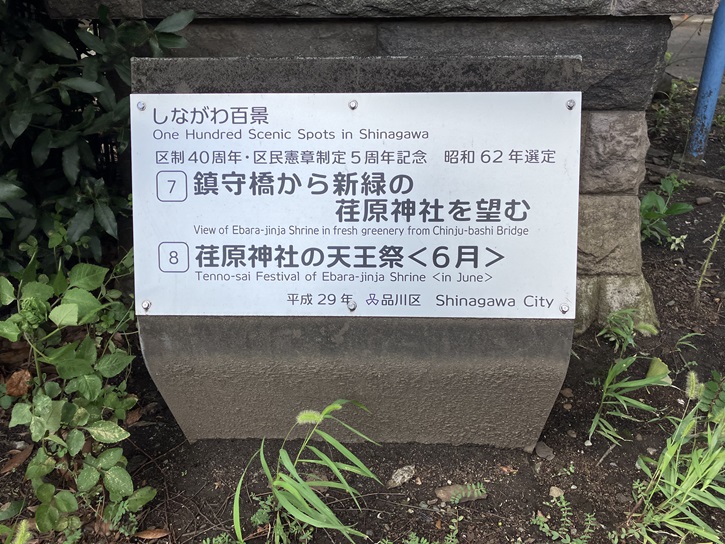 品川橋のすぐ上流に、欄干が朱色に塗られた橋が架かっています。橋の名前は鎮守橋で、北詰は荏原神社に繋がっています。いわば、参道橋です。