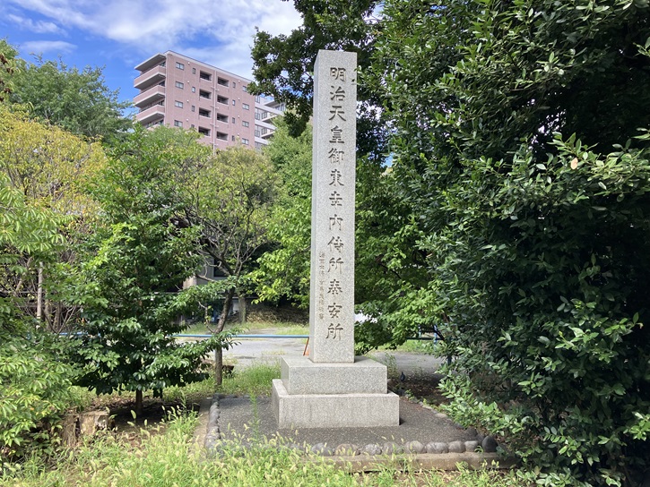 明治天皇の行在所になった品川宿本陣跡が昭和十三年(1938年)に東京市の公園となったのを機に設置された碑である。