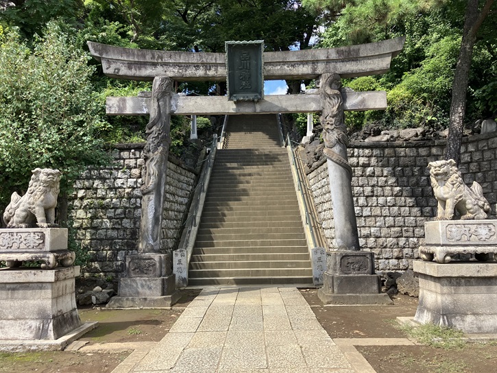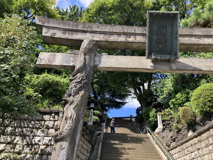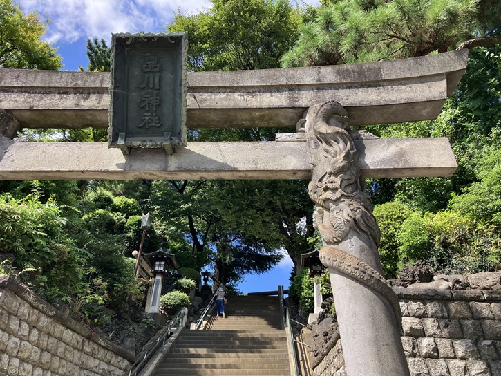境内に上がる参道石段下に、門柱に龍の細工が施された石鳥居「双龍鳥居」があります。左の柱に昇り龍、右の柱に降り龍が彫刻され、双龍鳥居は杉並区の宿鳳山高円寺と馬橋稲荷神社にもあり、品川神社と合わせて「東京三鳥居」ともいわれています。参拝すれば運気上昇間違いなしです。