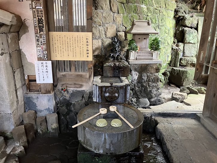 社内には「一粒萬倍の御神水」があり、備え付けのザルにお金を入れて御神水で洗うと何倍にも増えるという御利益が得られます。私は眺めただけでしたので、財布のお金は増えるどころか減る一方です。