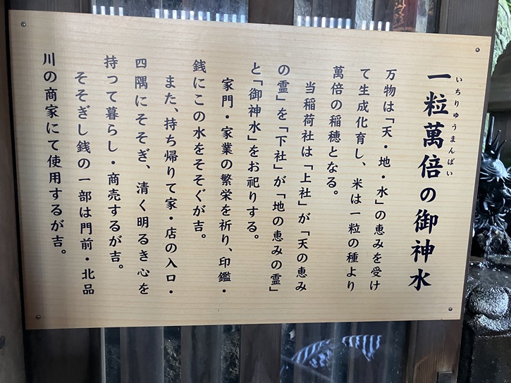 万物は「天・地・水」の恵みを受けて生成化育し、米は一粒の種より萬倍の稲穂となる。当稲荷社は「上社」が「天の恵みの霊」を「下社」が「地の恵みの霊」と「御神水」をお祀りする。家門・家業の繁栄を祈り、印鑑・銭にこの水をそそぐが吉。また、持ち帰りて家・店の入口・四隅にそそぎ、清く明るき心を持って暮らし・商売するが吉。そそぎし銭の一部は門前・北品川の商家にて使用するが吉。