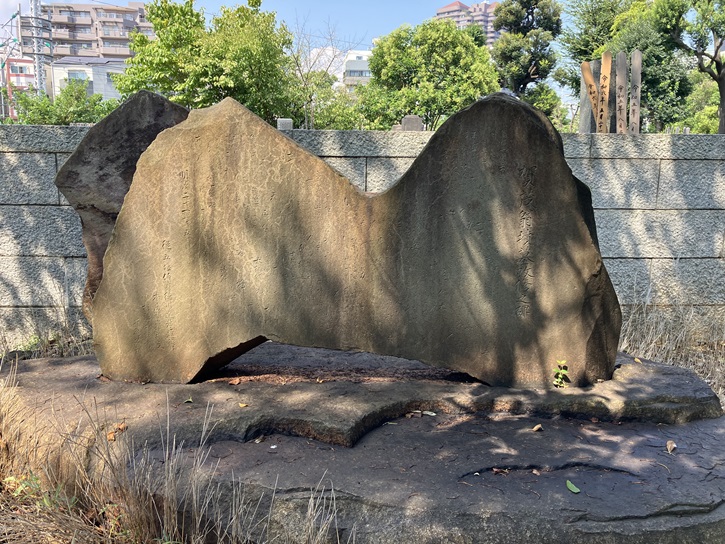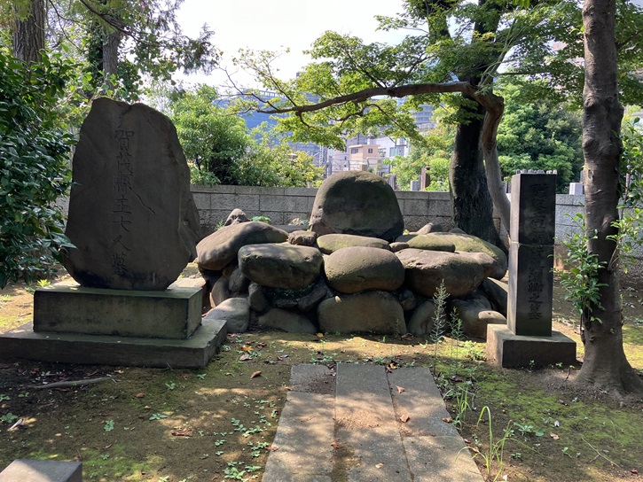 東海寺大山墓地の入口から左手の石段ではなく、線路に沿った坂道を進むと、左手に国指定史跡「賀茂真淵墓」があります。賀茂真淵は江戸時代の国学者で歌人です。石塀に囲まれた広い墓域の入口には、寺であるにもかかわらず鳥居があります。墓石には賀茂真淵の「方円論」が反映されていて、半円形の自然石となっています。