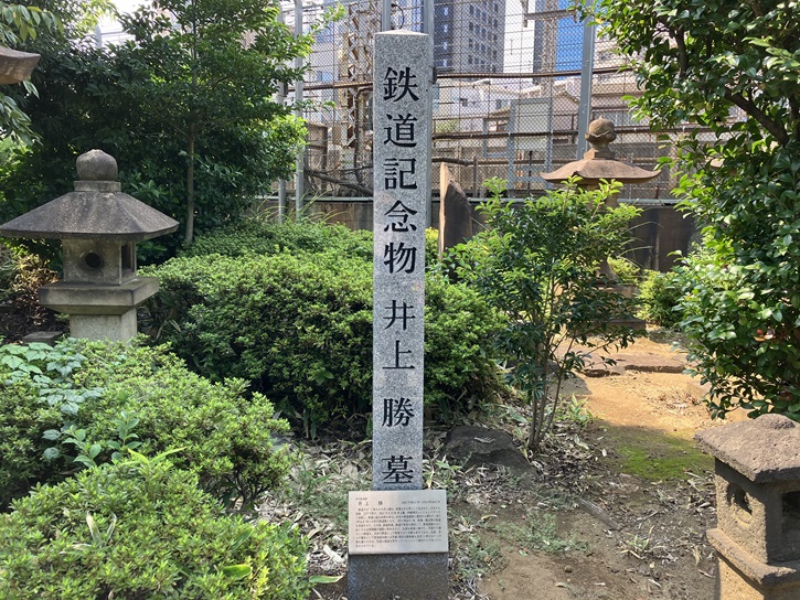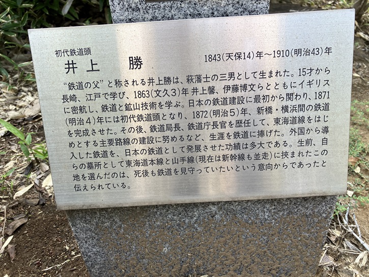 “鉄道の父”と称される井上勝は、萩藩士の三男として生まれた。15才から長崎、江戸で学び、文久三年(1863年)井上馨、伊藤博文らとともにイギリスに密航し、鉄道と鉱山技術を学ぶ。日本の鉄道建設に最初から関わり、明治四年(1871年)には初代鉄道頭となり、明治五年(1872年)、新橋・横浜間の鉄道を完成させた。その後、鉄道局長、鉄道庁長官を歴任して、東海道線をはじめとする主要路線の建設に努めるなど、生涯を鉄道に捧げた。外国から導入した鉄道を、日本の鉄道として発展させた功績は多大である。生前、自らの墓所として東海道本線と山手線(現在は新幹線も並走)に挟まれたこの地を選んだのは、死後も鉄道を見守っていたいという意向からであったと伝えられている。