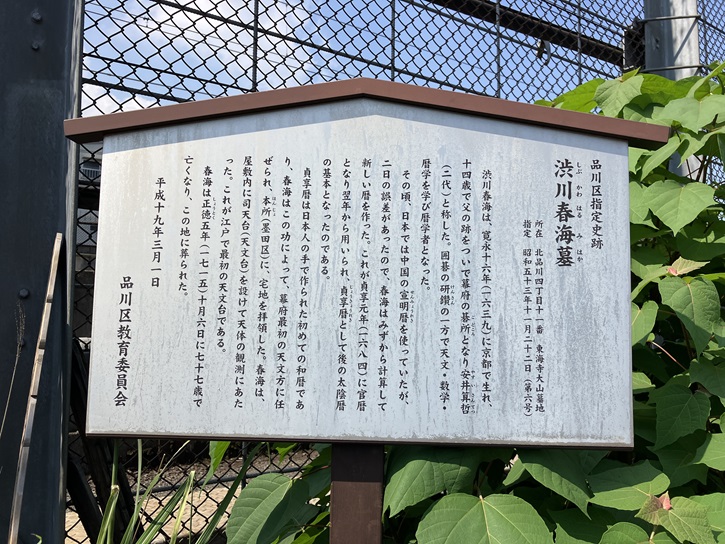東海道新幹線・山手線のフェンス際に、渋川春海のお墓があります。一列に並んだ一族の墓の左端にある「大虚院透雲紹徹居士」と刻まれた墓石が「渋川春海墓」です。