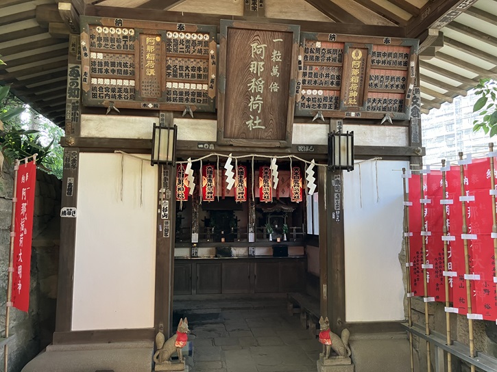 その右手にも鳥居が連なっていて、坂を下りた奥には金運や商売運のご利益があるとされる阿那稲荷社があります。鳥居の奥に社殿があり、神額には「一粒萬倍」の文字が書き添えられています。
