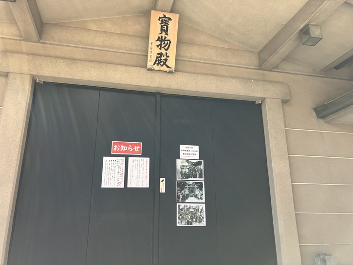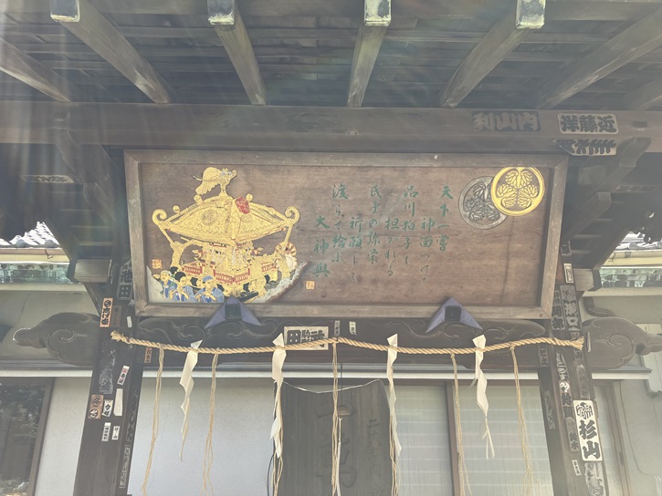 拝殿の左隣に寶物殿があります。庫には宝物や神輿が納められています。今は改修工事のために見ることはできません。額には、神輿の渡御風景が描かれています。「天下一嘗の面」は、慶長五年(1600年)に徳川家康が関ヶ原の戦いに出陣の際に戦勝を祈願し、合戦の後で勝利の御礼としてこの面を奉納しました。もとは舞楽の演目の「二の舞」に用いられる面で、室町時代中期に作られたと考えられています。江戸時代の中頃の疫病が流行したある年のこと、「この面を神輿に付け町々を廻れば苦しみから救うぞ」との神様のお告げがあり、以来、6月の例大祭ではこの面をお神輿につけて渡御し、無病息災・幸福招来を祈願するようになりました。「品川拍子」は、神輿が渡御するときの囃子となる音楽で、大拍子と呼ばれる桶胴の締め太鼓を竹で作った撥でたたき、俗称トンビと呼ばれる篠笛によって演奏されます。
