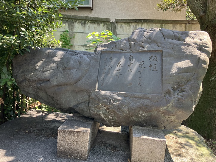 墓石の横には石碑が据えられ、「板垣死すとも自由は死せず」の言葉が記されています。揮毫したのは、自由民主党総裁で第六十三代内閣総理大臣だった佐藤榮作です。板垣退助らが結成した日本最初の近代政党である自由党は、現在の自由民主党の源流とされています。