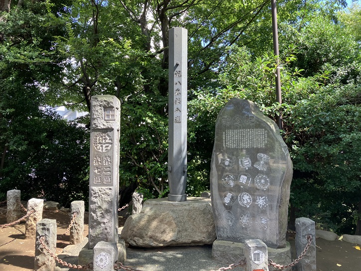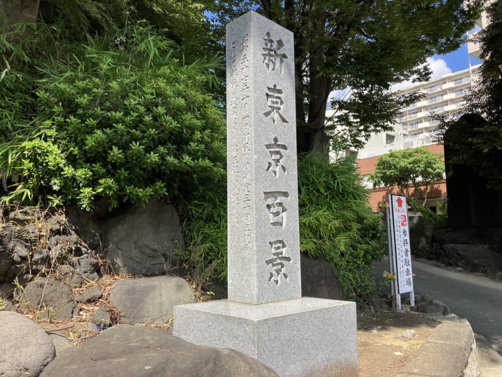 境内には幾つかの石碑が建っています。的矢の絵が描かれた記念碑の碑文にある「新東京八名勝」とは、1932年に報知新聞社が東京市拡張(近隣の5郡【荏原郡・豊多摩郡・北豊島郡・南足立郡・南葛飾郡】82町村の各全域を編入して新たに20区を置き東京35区となり、1936年には北多摩郡砧村・千歳村を世田谷区に編入して現在の東京都区部の範囲が確定)と報知新聞社の新聞発行二万号の記念を兼ねて選定されたものです。選定は投票で行われ、投票総数は実に850万以上でした。そして、第一位は池上本門寺、第二位は西新井大師と続き、第三位に品川神社が選ばれたのです。