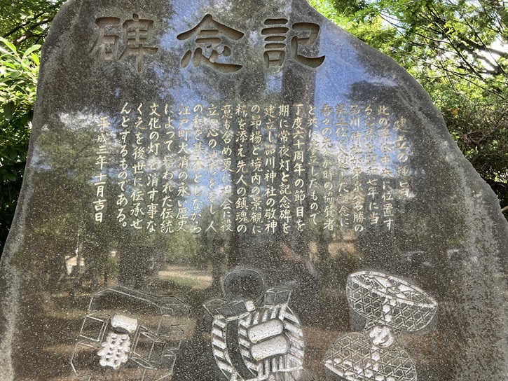 此の碑は中央に位置する心棒を昭和七年に当品川神社が東京八名勝の第三位に入選した記念に吾々の先人が時の協賛者と共に建立したもので、丁度六十周年の節目を期に常夜灯と記念碑を建立し品川神社の敬神の昂揚と境内の景観に粋を添え先人の鎮魂の意も含め更に社会に役立つ心の地形をなし人の和を基本としながら江戸町火消の永い歴史によって培われた伝統文化の灯を消す事なく之を後世に伝承せんとするものである。