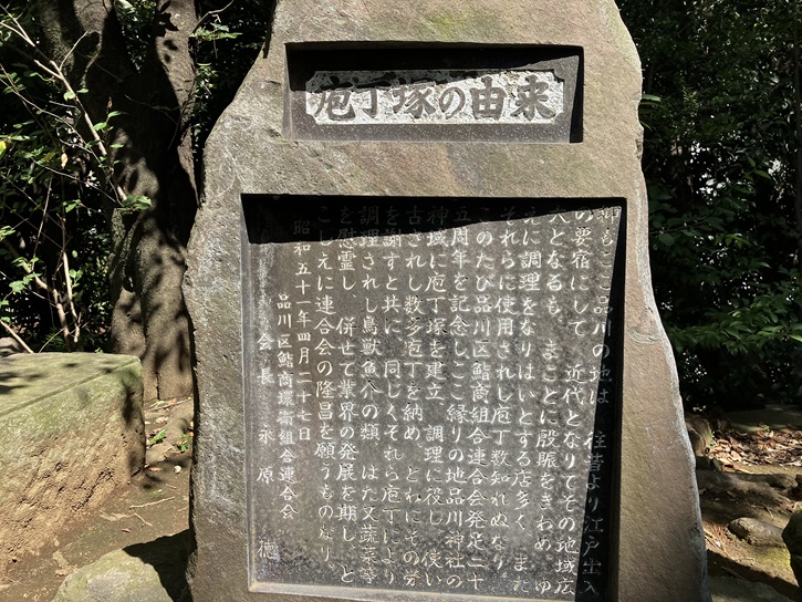 抑(そもそも)もここ品川の地は、往昔より江戸出入の要宿にして、近代となりてその地域広大となるも、まことに殷賑をきわめ、ゆえに調理をなりはいとする店多く、またこれらに使用されし包丁数知れぬなり。このたび品川区鮨商組合連合会発足二十五周年を記念し、ここ縁の地品川神社の神域に包丁塚を建立、調理に役し、使い古されし数多包丁を納め、とわにその労を謝すると共に、同じくそれら包丁により調理されし鳥獣魚介の類、はた又蔬菜(そさい)等を慰霊し、併せて業界の発展を期し、とこしえに連合会の隆昌を願うものなり。