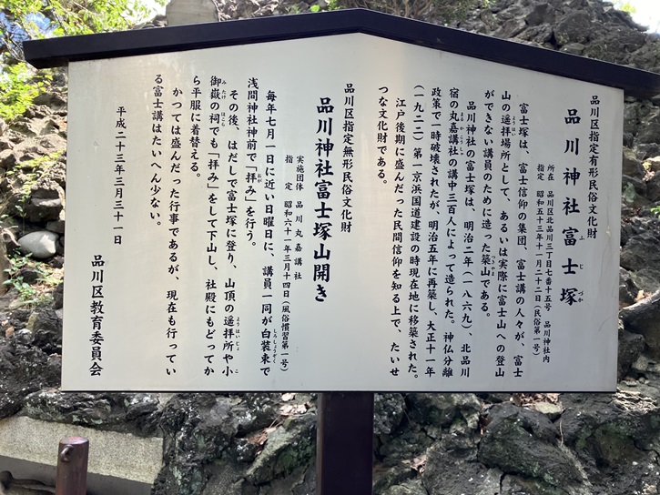 富士塚は、富士信仰の集団、富士講の人々が、富士山の遥拝場所として、あるいは実際に富士山への登山ができない講員のために造った築山である。品川神社の富士塚は、明治二年(1869年)、北品川宿の丸嘉講社の講中三百人によって造られた。神仏分離政策で一時破壊されたが、明治五年に再築し、大正十一年(1922年)第一京浜国道建設の時現在地に移築された。江戸後期に盛んだった民間信仰を知る上で、たいせつな文化財である。