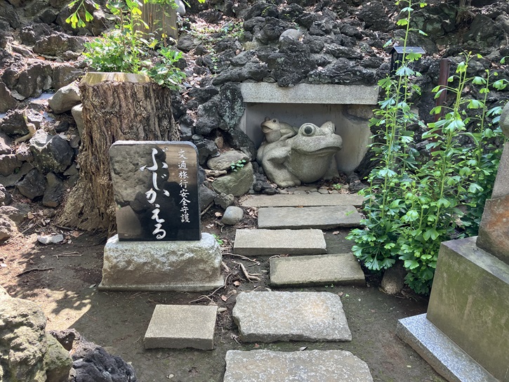 富士塚山麓の窪みに、蛙の石像が鎮座しています。これは「富士」と「かえる」をかけて「無事、帰る」、つまり安全守護の石像として作られたものだそうです。旅行の前などに参拝すると無事に帰宅できますね。