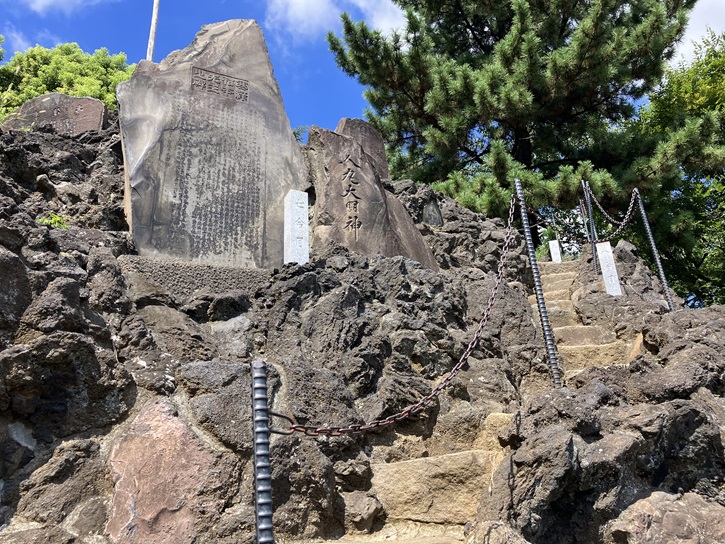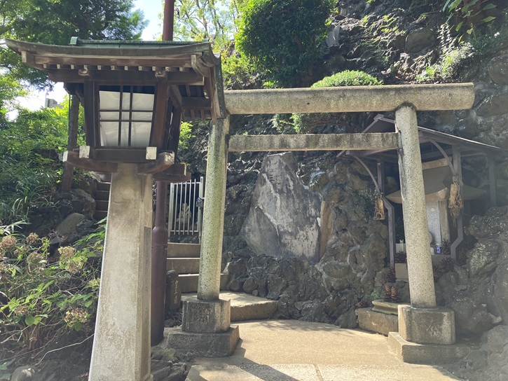 浅間神社の東隣には、崖を利用した都内最大の冨士塚が造られています。富士塚とは、富士信仰に基づき、富士山に模して造営された人工の山や塚をいいます。江戸時代には一般的に「お富士さん」などと呼ばれ、現在では「ミニチュア富士(ミニ富士)」などとも呼ばれています。富士塚を登ることで富士山を登ったのと同じご利益が得られるといわれていて、都内には数多くの富士塚が存在します。品川神社の富士塚「品川富士」は比高約15mで、江戸七富士と呼ばれる七つの富士塚の中でも最大といわれています。毎年7月1日に近い日曜日には「山開き」の神事も行われていますが、品川冨士は一年中登ることができます。